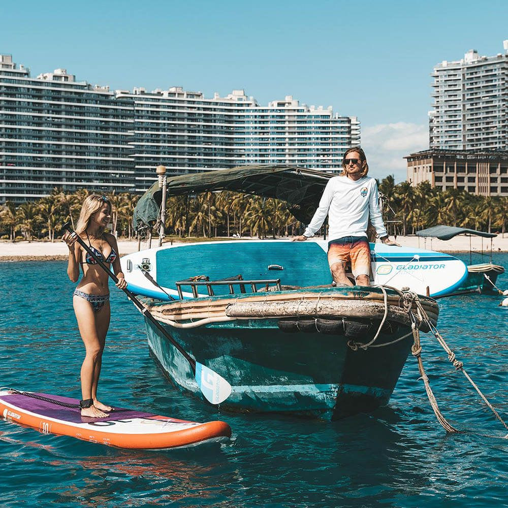 A GLADIATOR SUP több mint, egy sima felfújható deszka. A stabil hátsó rész könnyebb manőverezést biztosít. A könnyű ergonomikus SUP evező javítja a deszka egyensúlyozását és csökkenti a néha megterhelő kétoldali evezésintenzitását. A deszka orrán található gumipántok a csomoagjaid rögzítéséhez nyújtanak segítséget.