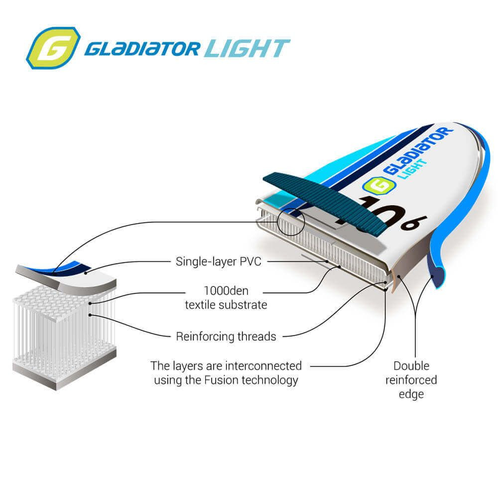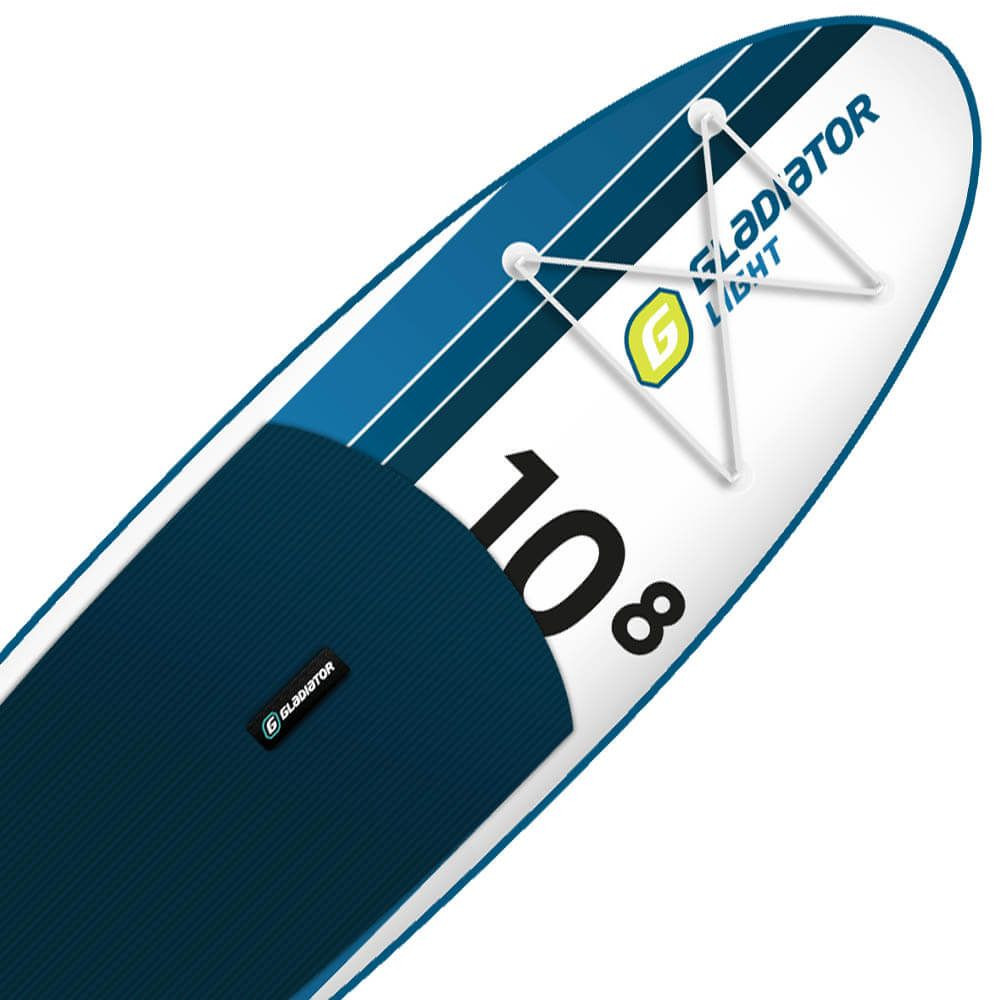 A Gladiator Light egy változatos, modern SUP deszka. Maximális terhelhetősége 110 kg, rendkívül stabil és jól irányítható. Körvonala 10'8 x 34 x 6'', keskenyebb középső és szélesebb hátsó résszel rendelkezik, így a deszka nagyszerű csúszást biztosít nyugodtabb tavakon és tengereken, de még folyókon is.